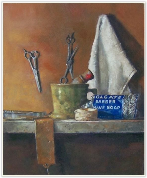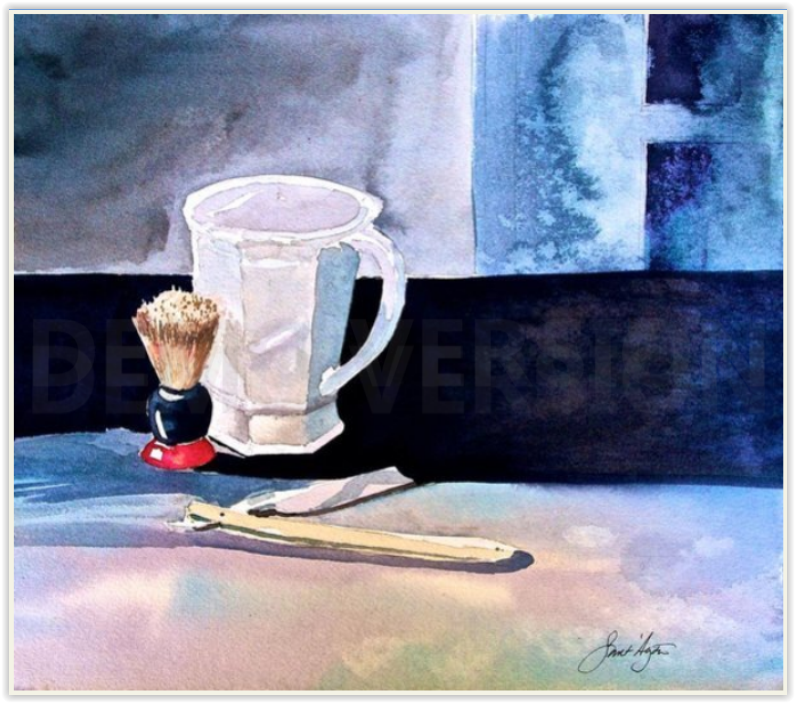 Фрэнк Сант'Агата „На протяжении пяти десятилетий изобразительного искусства и дизайна мои работы всегда были выражением моей привязанности к моим предметам. Я всегда был близок к старым вещам, потому что люблю и ценю тонкое мастерство и ручную работу, вложенные в их создание. Если и когда что-то коснется вашего сердца, я буду рад, если вы возьмете немного моей работы в свой дом, чтобы насладиться ею и поделиться ею с другими. Спасибо и наилучшие пожелания, Фрэнк Сант'Агата” „Shaving stuff” „Бритвенные принадлежности” 2012 г. Frank Sant'agata Майк Биман Он родился в Колорадо. В 1968 году он переехал в Вайоминг. Он рисует столько, сколько себя помнит. Сейчас Майк все свое время занимается рисованием пастелью и акварелью. За свою карьеру он участвовал во многих групповых выставках, а также в различных персональных выставках. „Nature morte” Mike Beeman С 2013 г. с кайфом бреюсь опасной бритвой пять раз в неделю, в три прохода.