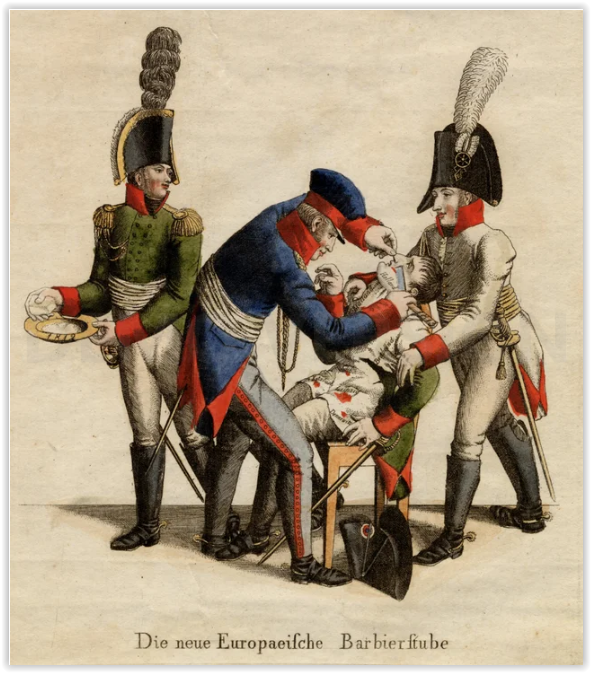 Опасная бритва в искусстве (картины, рисунки, фото, тату)Долго ищу. Иногда больше часа. Потом проверяю в теме, чтобы не повторялись. Вот, пожалуйста, невероятно прикольная вещь. Пропагандный плакат на немецком языке 1813 г. „Die neue Europaeische Barbierstube” "Новая европейская парикмахерская". Россия, Пруссия и Австрия бреют Наполеона после серии побед в Лейпциге, Италии, Голландии и т. д. 1813 г. Обратите внимание, что бритьё кровавое.