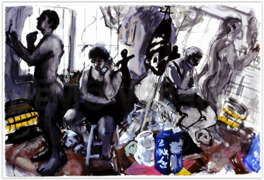 „Вarber shop scene” - „Сцена в цирюльне” Wendy Elizabeth Sharpe, Венди Шарп - Родилась в 1960 г. Одна из самых титулованных художников Австралии. Живет и работает в Сиднее и Париже. Man shaving, woman reading 2005 г. „Мужчина бреется, женщина говорит по телефону”. С 2013 г. с кайфом бреюсь опасной бритвой пять раз в неделю, в три прохода.