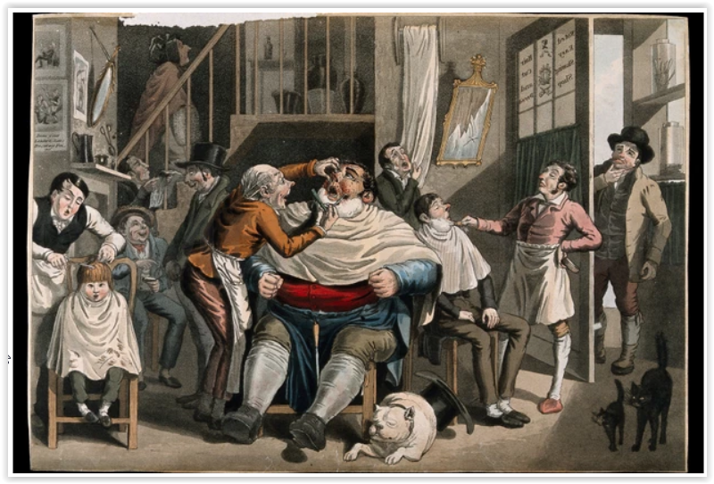 Thomas Rowlandson (1757–1827) - английский художник, карикатурист, книжный иллюстратор и George Murgatroyd Woodward (1765–1809) - английский карикатурист и писатель-юморист. „Barber” „Брадобрей” 30 августа 1799 г. Цирюльник теряется в собственном разговоре, рассказывая о своем знакомом из Амстердама. „Алееее, - кричит бедный клиент, - ты что, собираешься отрезать мне нос?!” Еще раз Thomas Rowlandson Томас Роулендсон „A Barber's Shop” „В цирюльне” С 2013 г. с кайфом бреюсь опасной бритвой пять раз в неделю, в три прохода.