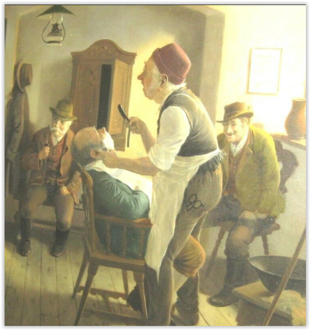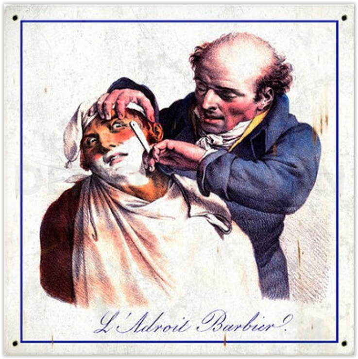 Гравюра с названием „Умелый брадобрей” (L'Adroit Barbier) Этот же рисунок на металлической вывески для цирюлни. Видны отверстия для крепления. „Умелый брадобрей” Percy Robert Craft (1856–1934) Перси Роберт Крафт был английским художником акварелью, маслом и пастелью, а также профессиональным актером. „Barbers shop”, 1890 „Цирюлня” С 2013 г. с кайфом бреюсь опасной бритвой пять раз в неделю, в три прохода.
