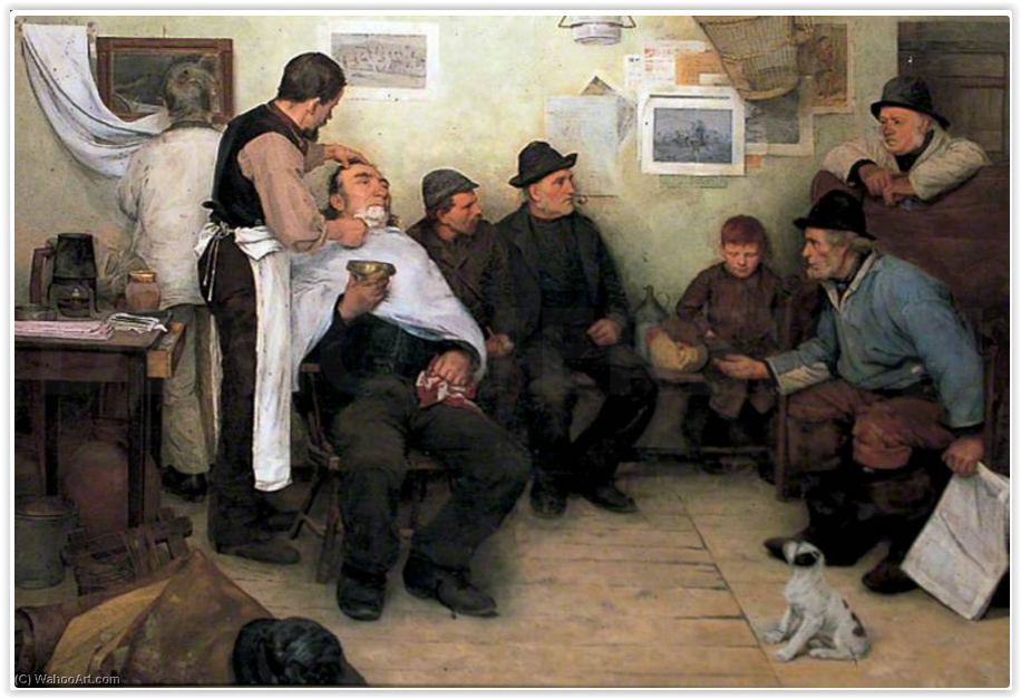 Albert Joseph Franke (1860–1924) Альберт Франке жил в Германии и Польше. Известен живописью на восточную тематику. „The barber's shop” „Цирюльня”, 1886 Pio Joris (1843-1921) Пио Йорис. Он родился в Риме. В 1870-х годах Йорис путешествовал по Европе. Его присутствие задокументировано в Лондоне, Париже и Испании. Он достиг пика своего успеха между 1880-ми и 1890-ми годами, завоевав многочисленные общественные награды за анекдотический стиль исторической живописи и приятные жанровые сцены. „'I barbieri di Roma” „Римские цирюльники” С 2013 г. с кайфом бреюсь опасной бритвой пять раз в неделю, в три прохода.