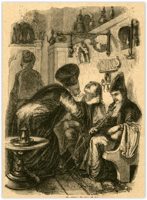 „The barber” „Цирюльник” „Barber with a customer and an assistant, Trichinopoly” „Цирюльник с клиентом и ассистентом, Трихинополи (Трихинополи был районом Британской Индии). Denis Auguste Marie Raffet, Дени Огюст Мари Раффе (1804-1860) был французским иллюстратором и литографом. Barbier tsigane Foire de Giourjévo (Valachie)” „Цирюльник циган на ярмарке в Джуржево 11 июля 1837 г. (Валахия - историческая область, расположенная на юге современной Румынии) С 2013 г. с кайфом бреюсь опасной бритвой пять раз в неделю, в три прохода.