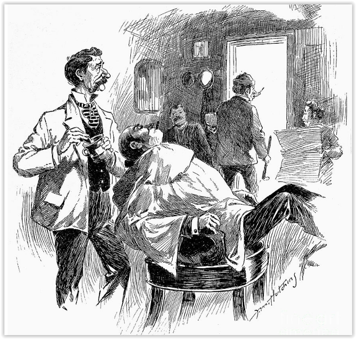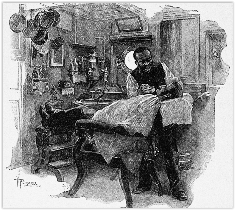 „Barbier armеnien а Konstantinopel” „Армянский парикмахер в Константинополе” 1850 г. Victor Semon Perard (1870 -1957) Виктор Семон Перар - литограф, иллюстратор, лектор, педагог и писатель, французского происхождения. „The barber giving a shave to a passenger on an ocean steamer” 1890 г. „Парикмахер бреет пассажира на пароходе” Некто Hutchin …., из американского журнала 1894 г. „Didn't Know His Business” „Не знаю, что его бизнес”