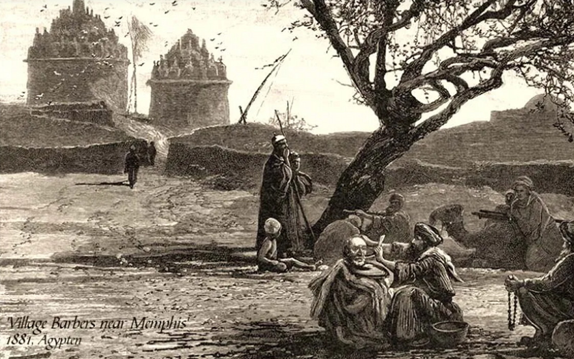 „A Man at a Barber’s Shop” „Мужчина в парикмахерской” Неизвестный художник, надпись внизу слева: „Village barbers near Memphis 1881 Agypten” „Деревенские цирюльники возле Мемфиса 1881 г. Египет” С 2013 г. с кайфом бреюсь опасной бритвой пять раз в неделю, в три прохода.