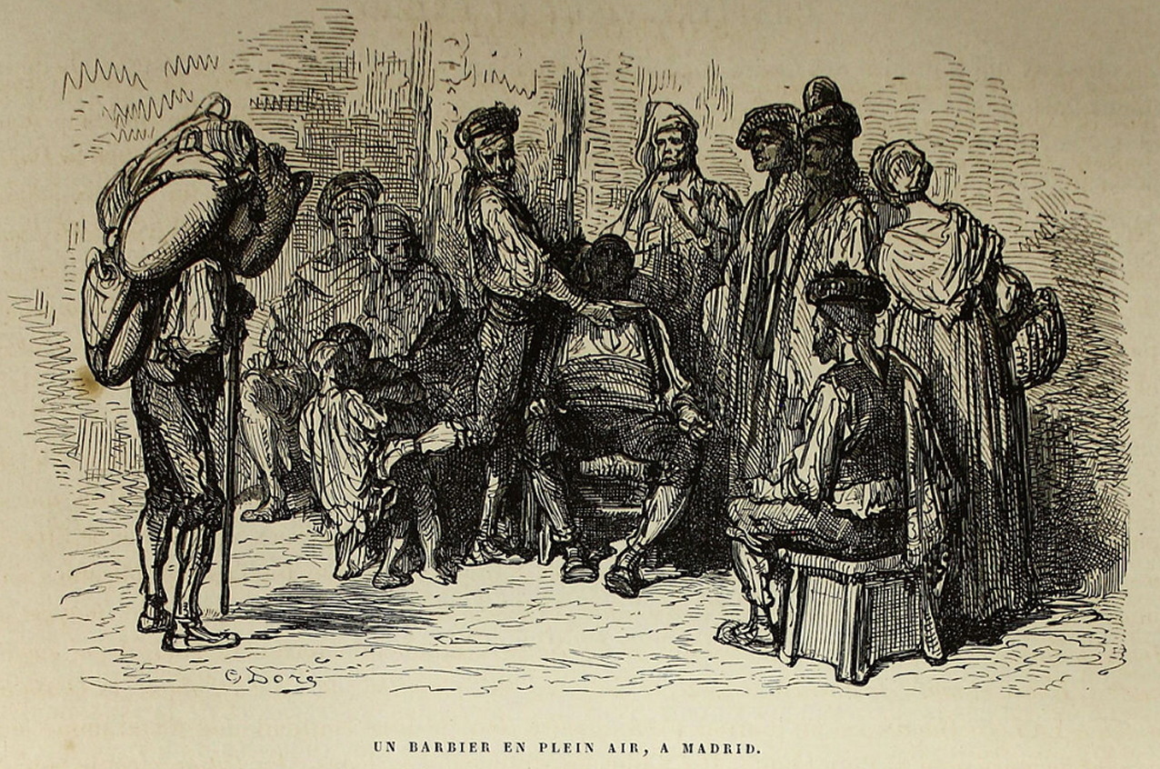 Иллюстрация к книге „The History of Tom Jones” 1895 г. „Tom Jones and the barber, Little Benjamin” „Том Джонс и цирюльник Маленький Бенджамин” Paul Gustave Louis Christophe Doré (1832-1883) Поль Гюстав Луи Кристоф Доре был французским художником, гравером, иллюстратором, художником комиксов, карикатуристом и скульптором. "Un barbier en plein air, a Madrid" 1874 г. „Парикмахерская на открытом воздухе в Мадриде” Неизвестный художник, гравюра опубликована в 1858 году в газете в Лондоне. „Barbershop at Manila, Philippines” „Парикмахерская в Маниле, Филиппины” С 2013 г. с кайфом бреюсь опасной бритвой пять раз в неделю, в три прохода.
