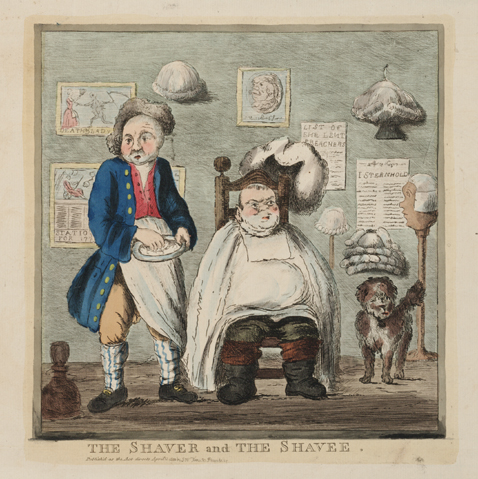[Thomas Rowlandson (1756-1827)]. London, Published by William Holland, [1789]. Etching with aquatint. 789.0.59 BMCat 7605 The barber holds his bowl and soap and is watched with apprehension by his customer. Meanwhile, another man is stanching a wound over a basin, and the barber's helper irons a wig. On the floor and on the walls are wigs (including the customer's?), wig-blocks, and a razor.