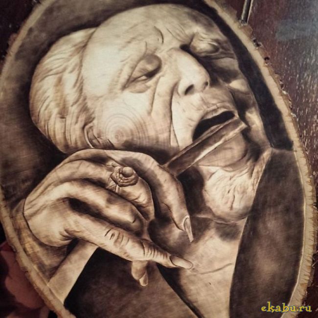 Re: Интересные фото с бритвойХудожник Рик Мериан (Rick Merian) вместо обычного холста использует дерево, а кистью ему служит инструмент для выжигания по дереву.