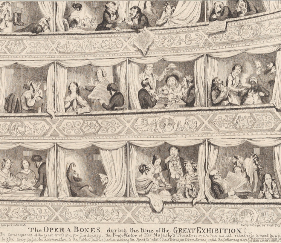 „The Opera Boxes during the time of the Great Exhibition” „Оперные ложи во время Великой выставки” 1851 г. Никто на сцену не смотрит, например, мужчина бреется The Great Exhibition of the Works of Industry of All Nations) - международная выставка достижений науки, промышленности, искусства и торговли, проходившая в лондонском Гайд-парке с 1 мая по 15 октября 1851 года. Выставка стала важным этапом в распространении идей промышленной революции. Из-за участия многих стран её вскоре прозвали Всемирной. На этой первой Всемирной выставке были представлены промышленные товары, различные изделия художественных ремёсел, машины и механизмы, экспонаты новейших производственных технологий, произведения изобразительного искусства.