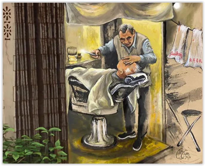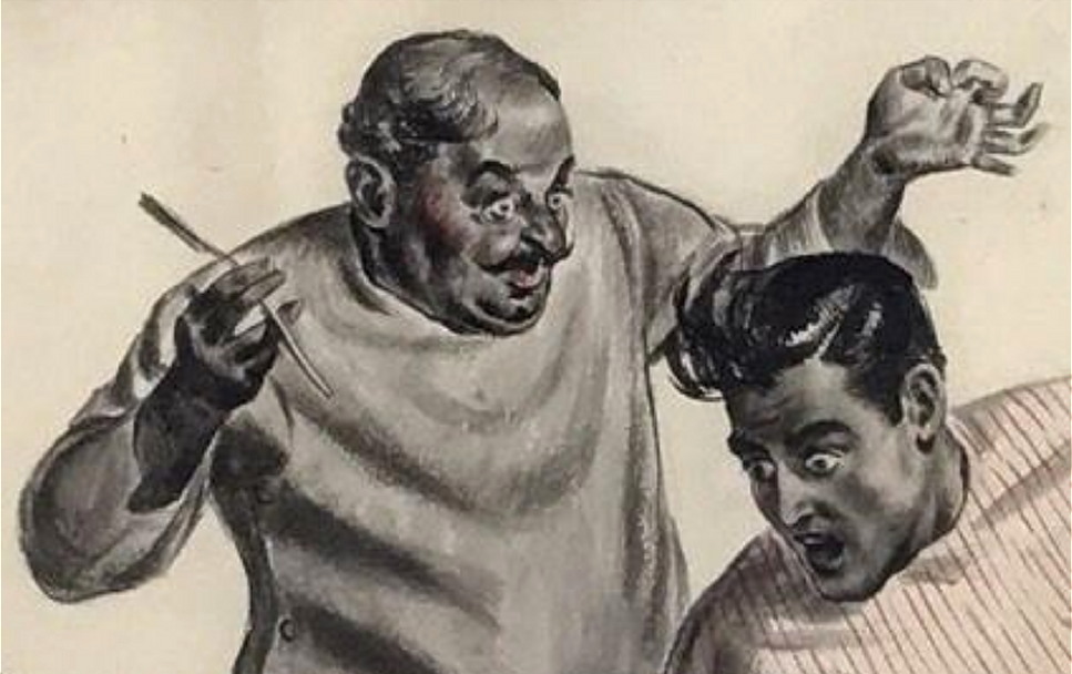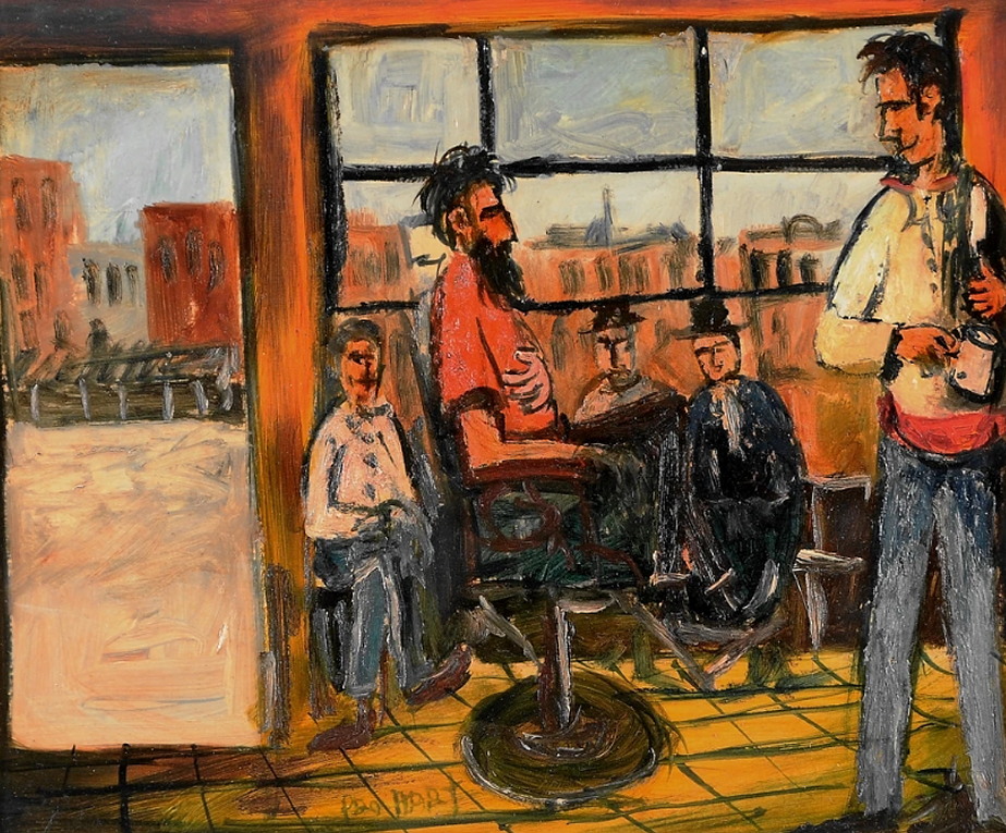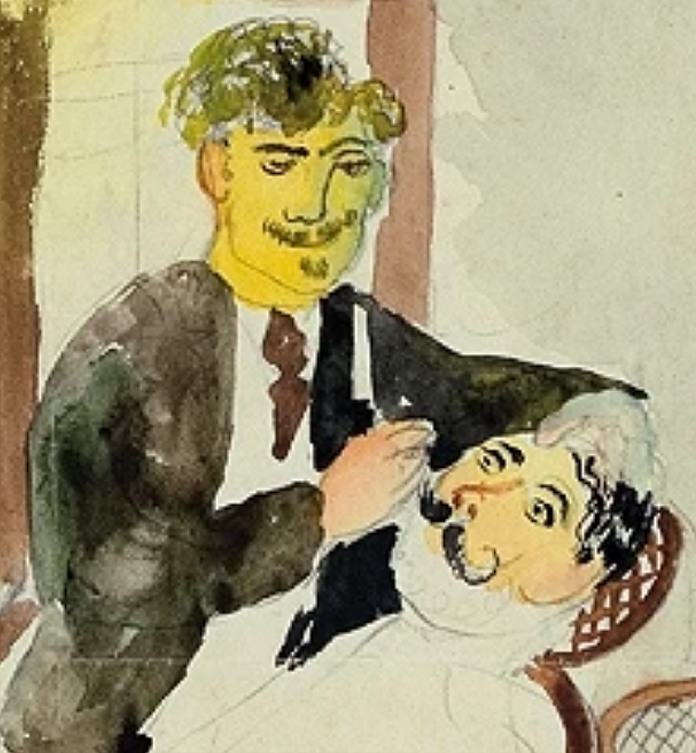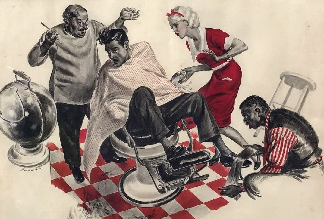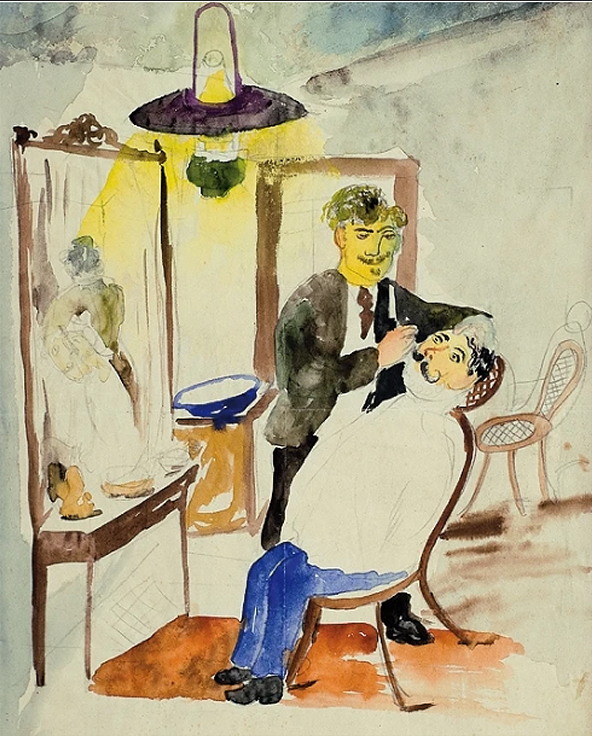 „At the Barber” „У цирюльника” 1924 г. Взглянем поближе: С 2013 г. с кайфом бреюсь опасной бритвой пять раз в неделю, в три прохода.