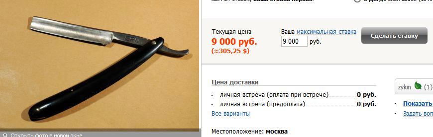 1. г. zykin, с репутацией в один бал, предлагает нам прекрасный ern по начальной ставке всего в каких то жалких 9000 руб. http://molotok.ru/britva-opasnaya-zolin ... 64760.html" onclick="window.open(this.href);return false; 2. г. Яхтинг: С начальной ставкой в 9999 руб, не правда ли цена вполне приличная для столь старой бритвы...У меня есть бритва с цифрой 42, видимо сделана в 42 году от Р.Х., продам всего за 2000 руб! Спешите!!!! http://molotok.ru/opasnaya-britva-wald- ... 52302.html" onclick="window.open(this.href);return false;