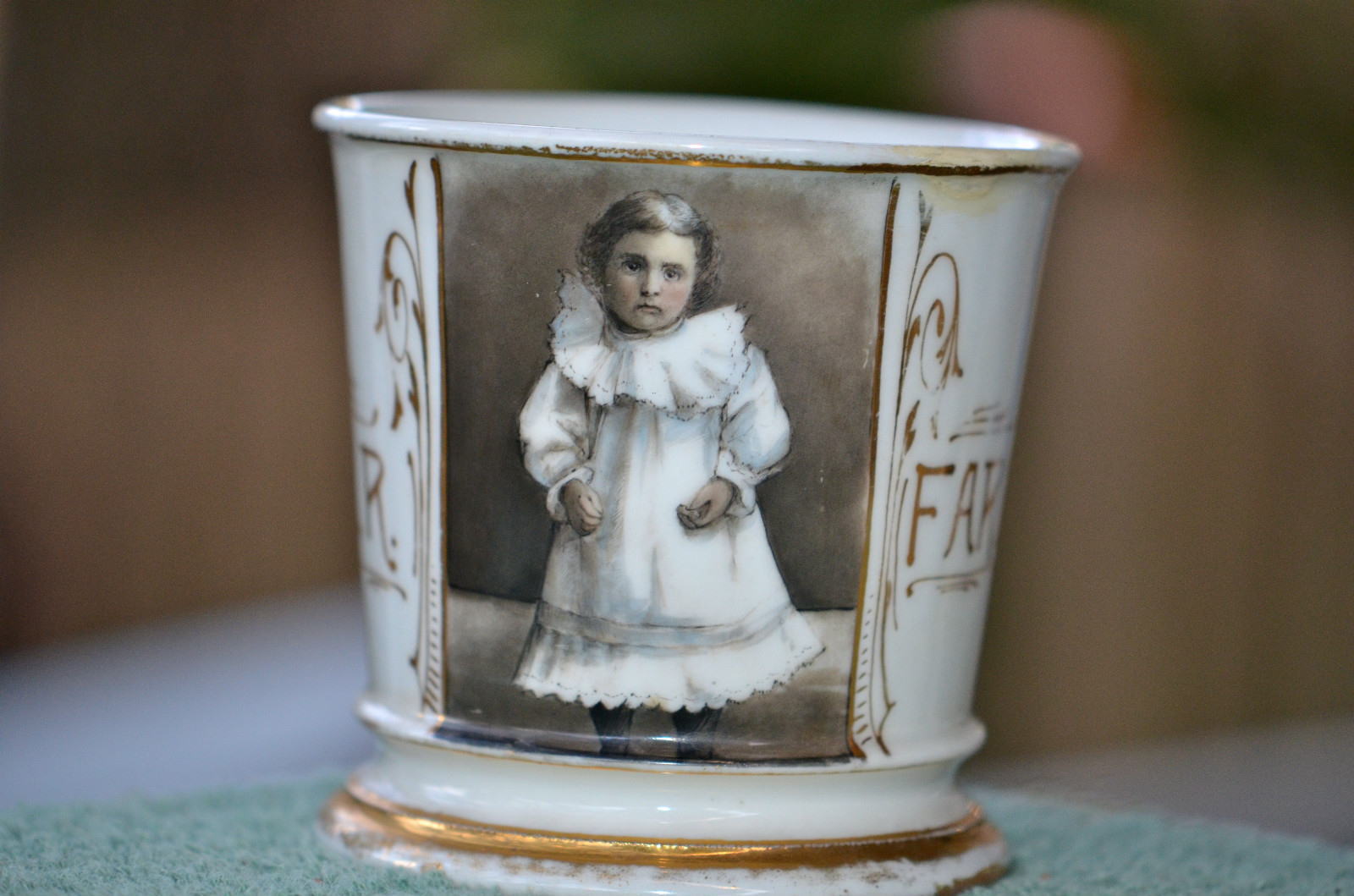 Fantastic photographic shaving mug of young child shaving mug. Mug is 3 and 5/8" tall, Hegner Barber supply mark on bottom out of Minnesota and Limoges markings. Came out of an old collection of shaving mug. Small old repair on rim to right of photograph, several photos showing repair, and a hairline in the handle, the handle has not been broken off, just a hairline only. Great large and clear image.