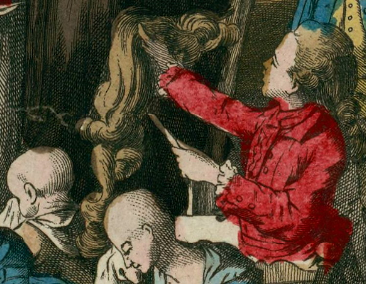 На гравюре нарисован Ричард Аркрайт - крупный английский текстильный промышленник, изобретатель, владелец многочисленных патентов в области прядения, который в начале своей трудовой жизни работал цирюльником и мастером париков. „Strange contrivances were beginning to shape themselves in his busy brain” „В его напряженном мозгу начинали формироваться странные выдумки” Взглянем поближе: С 2013 г. с кайфом бреюсь опасной бритвой пять раз в неделю, в три прохода.