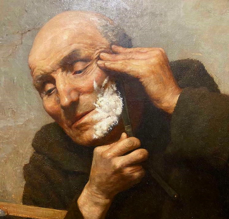 Сигер также был известен как талантливый гравер. Олег Бритва, посмотри, картина маслом, но выглядит как фотография. „Morning shave” „Утреннее бритье”, 1889 г. Взглянем поближе: