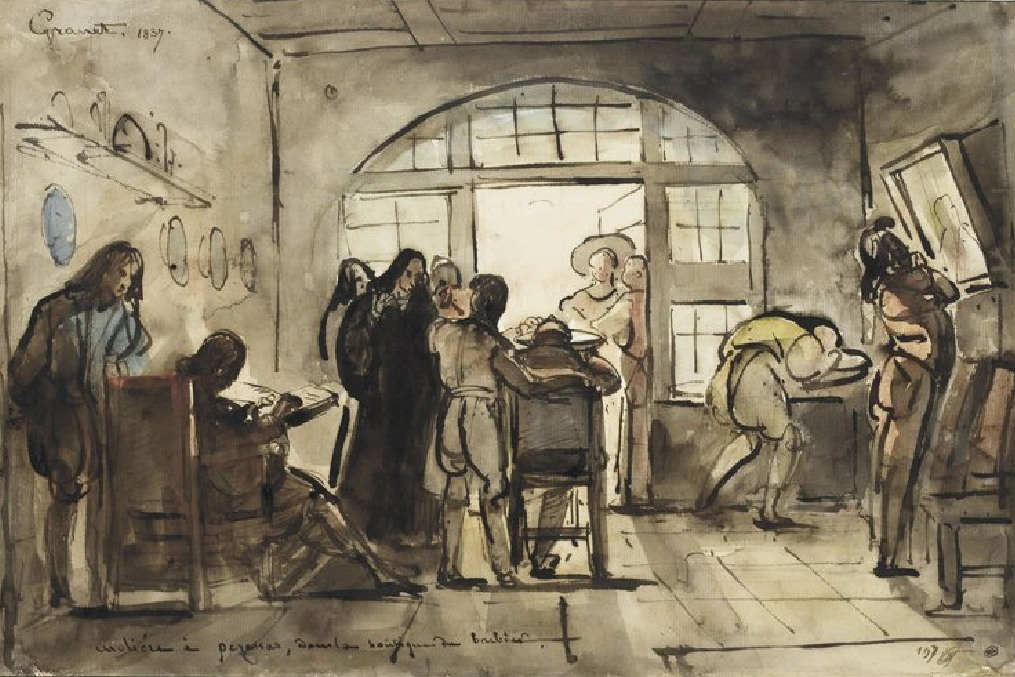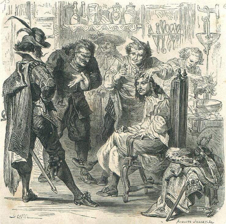 Картина создана по сюжету комедии Емиля Блемонта и Леона Валаде (Emile Blemont, Leon Valade) „Пезенаский цирюльник” (Le barbier de Pеzenas). „Moliere а Pеzenas, dans la boutique du barbier” „Молиер в Пезенас, в цирюльне” Они стоят со спиной к „камере”, поэтому плохо видно бритвы: