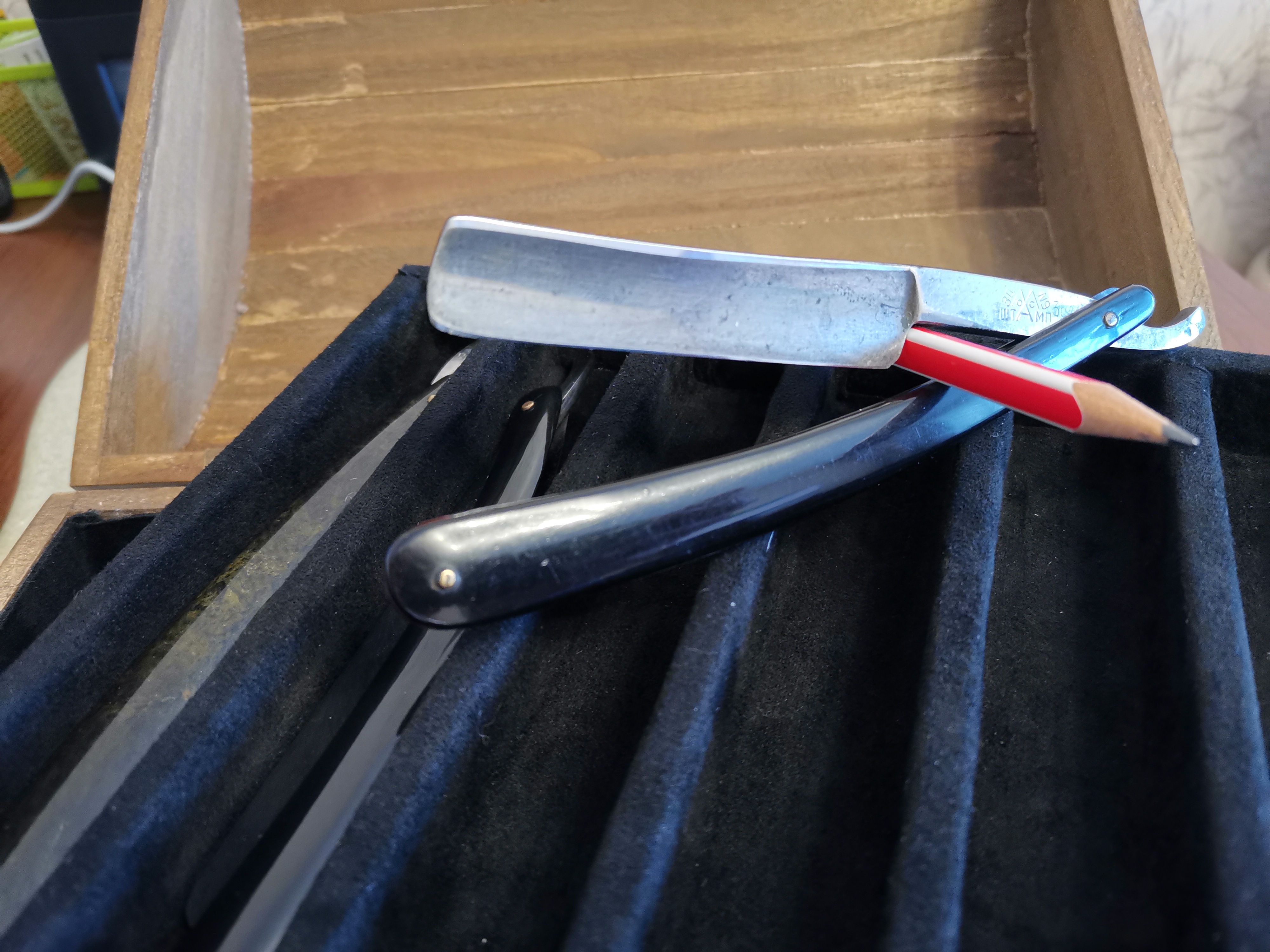 Бритва - Шикарнючая! Тут заклёпки медные - уже слюна бежит. Ручки, как раз и выдают ее возраст. Стих и тд, этим ещё не баловались. Вообще Класс!!! Музей прям!