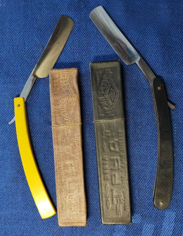 Бритвы с такой четырехугольной ручкой встречались только в 1941 году, ручки как трехпиновые, так и однопиновые. Два раза встречалась бритва с таким клеймом (перевернуто "р-п Вача", без указания года). Отличный фотообзор такой бритвы здесь: