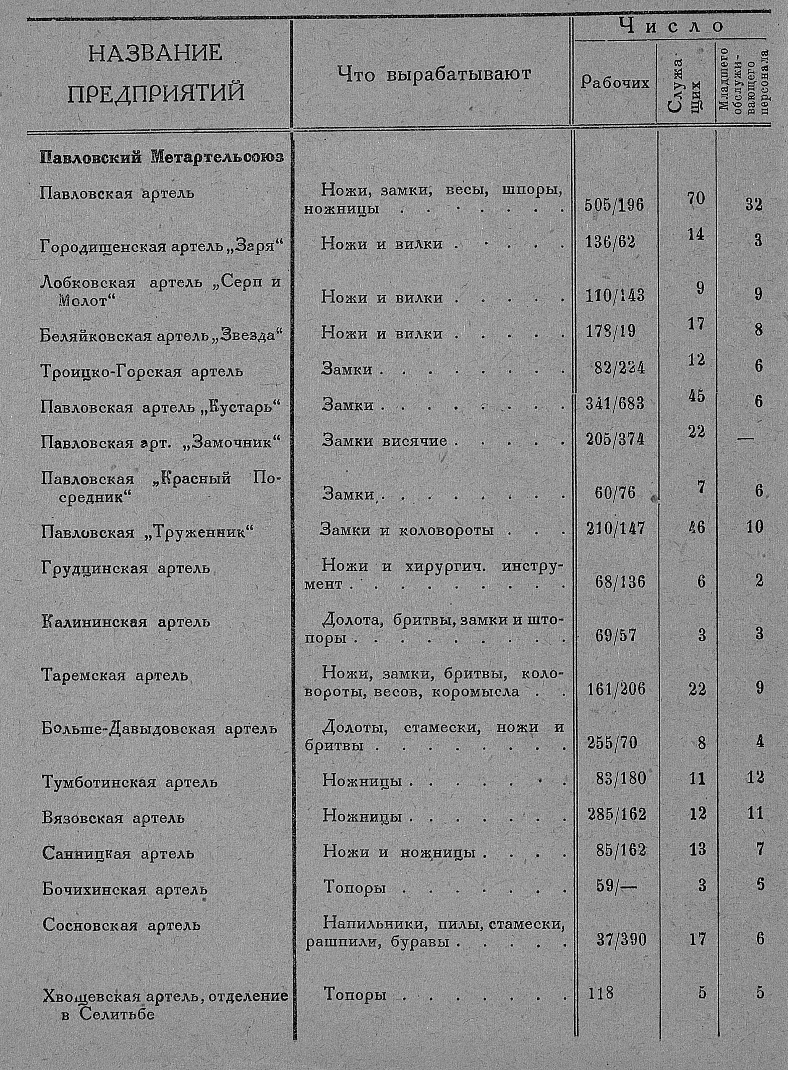 Список артелей Павловского Метартельсоюза на 1 октября 1929 года