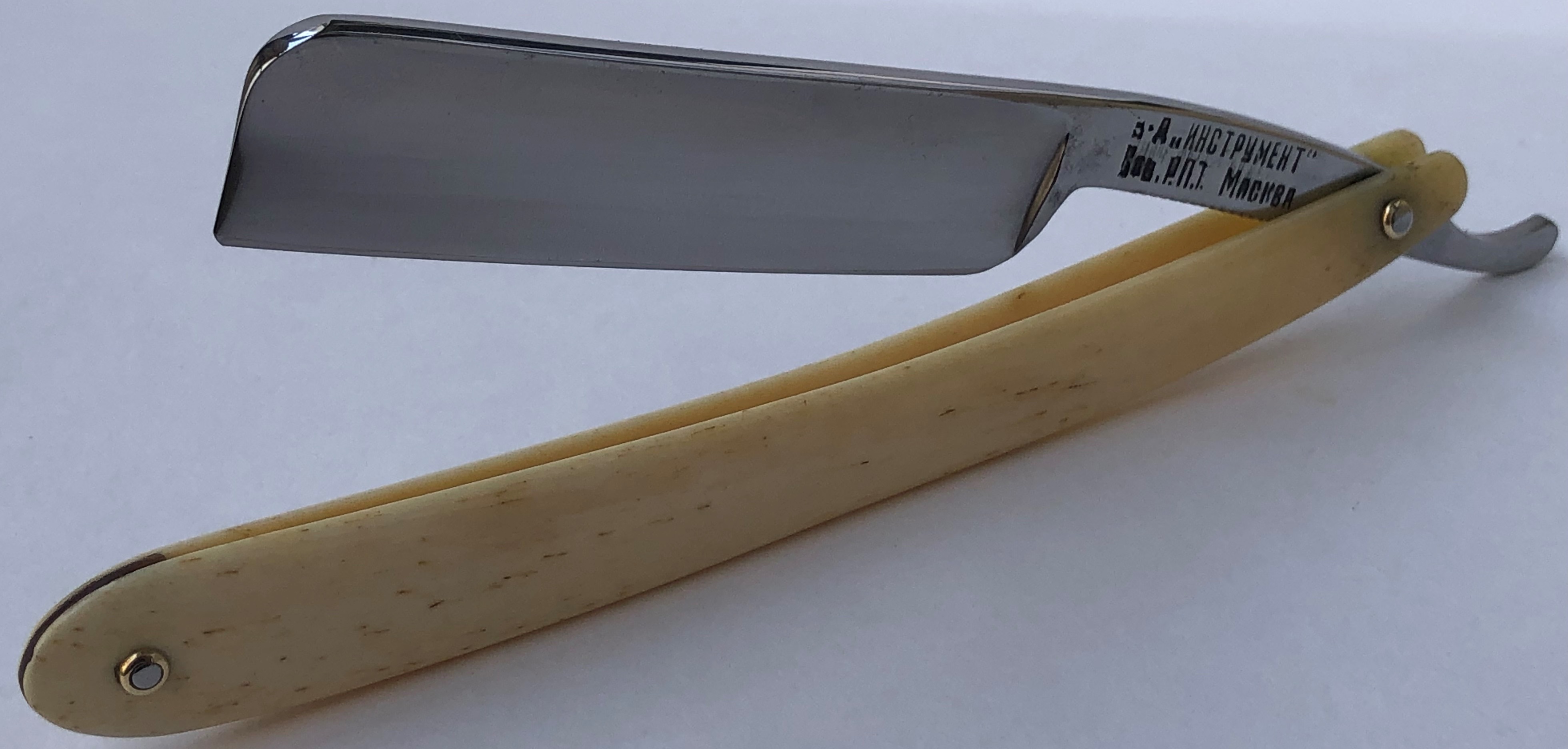 Пока мне в руки не попал "Инструмент".Попал впервые и попал совершенно в непользованном состоянии.Бритву разобрал и немного привел в порядок.Что интересно, сама форма лезвия совершенно не схожа ни с одной советской бритвой. Больше напоминает что то от немецкого производителя. Но главное, это вес клинка.Клинок действительно тяжелый, массивный и с идеальной геометрией.Наверное самый тяжёлый клинок из всех советских. А тут еще родная оправа из натуральной кости. На сколько мне не изменяет память, то ручки из кости делали ещё 2 ГПЗ.Больше не припомню.Единственно что смутило, это достаточно толстые и неэластичные плашки, что не дает возможность хорошо отрегулировать осевой механизм. Но, в моём случае все получилось и клинок " не проскальзывает".Ну и наверное самая важная вещь, это качество стали.Я сужу с точки зрения заточника, и если бы не знал, что это бритва советского производства, то подумал бы, что точу иномарку высокого качества. Заточка идеальная, тест на рез волоса проходит мягко, как и положено. Ну и естественно бритье. Когда ещё предоставится возможность лично протестировать такую вещь. Вот чего ожидал от советской бритвы, это фирменный "металлический" характер сбриваемой щетины. Тут такого нет. Ощущение, что просто снимаешь пену с лица. После бритья тест на рез волоса, без правки на ремне. Вот совершенно согласен с Олег Бритва, что этот "Инструмент" наиболее удачный из всего того, что выпускалось у нас в прошлые годы. Короче, умели делать у нас бритвы тоже..