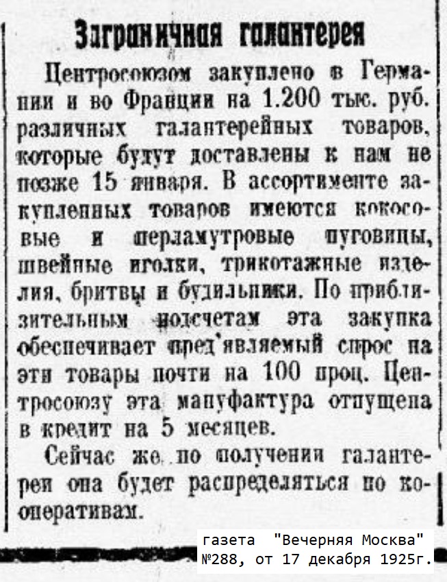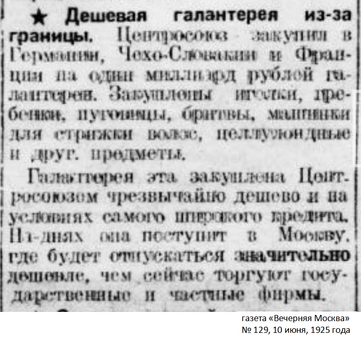 Центросоюз - закупил в Германии, Чехо-Словакии и Франции на один миллиард рублей галантереи. Закуплены иголки, гребенки, пуговицы, бритвы, машиинки для стрижки волос и другие предметы.