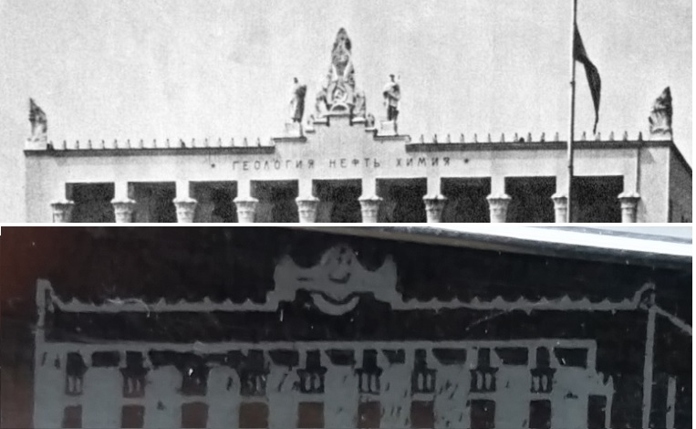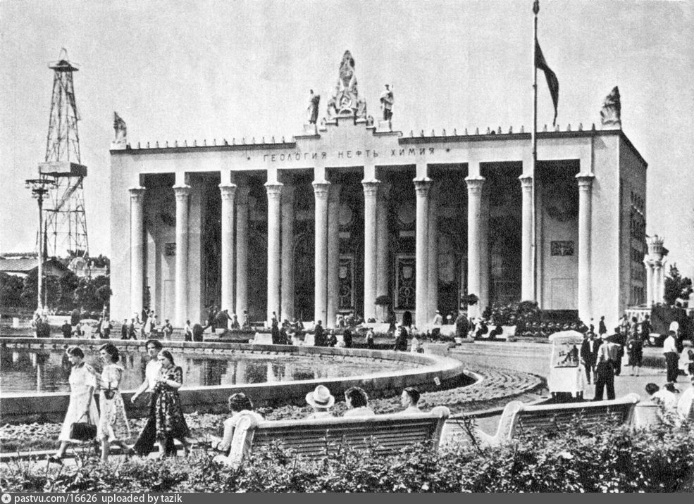 сдается мне это Павильон "Геология, нефть, химия". Количество колонн совпадает, да и вышки слева