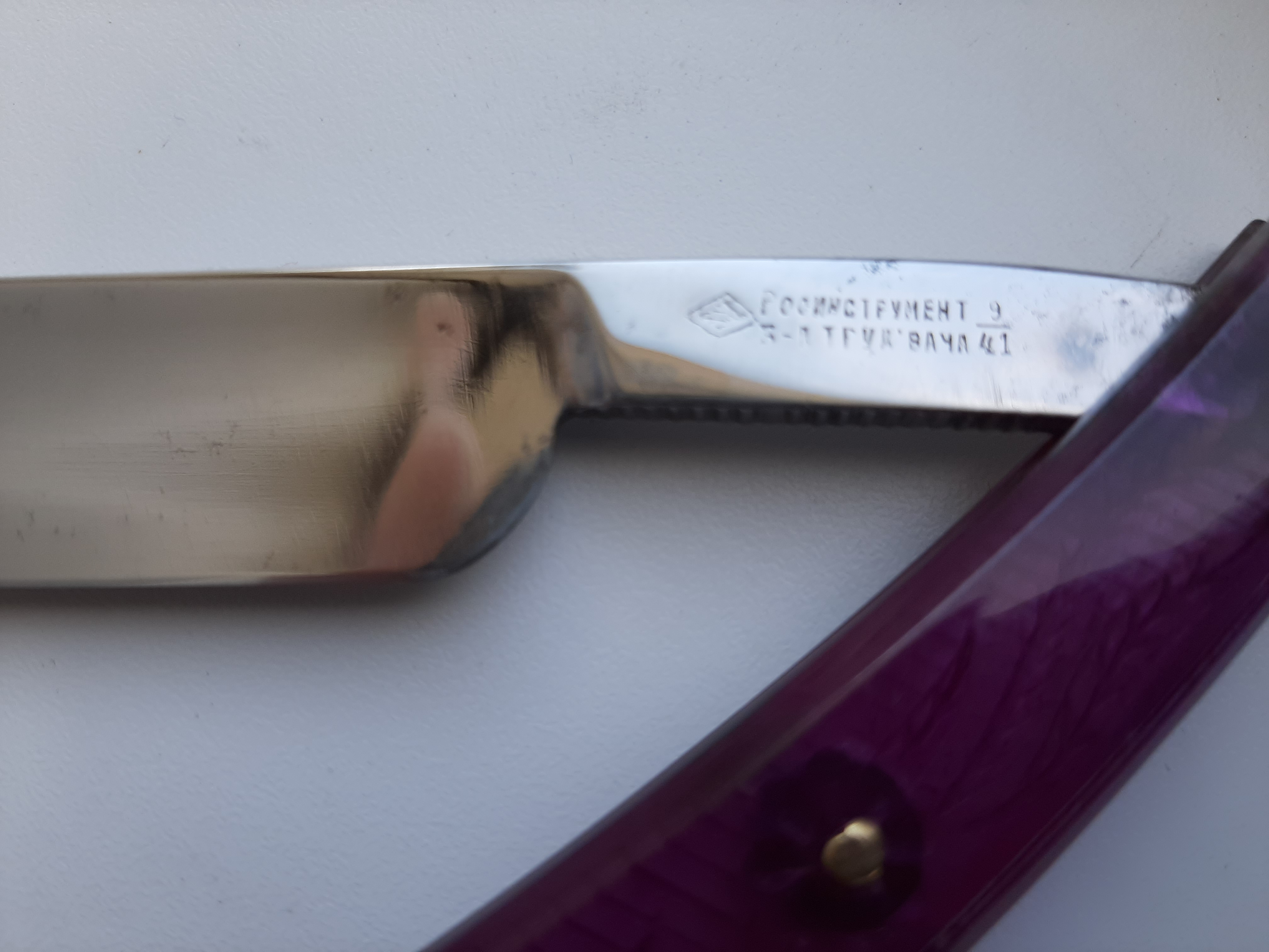 У меня такое же клеймо на бритве, только 7/41г. выпуска, 2х пиновая оправа черно-зеленый перламутр,не прозрачная.