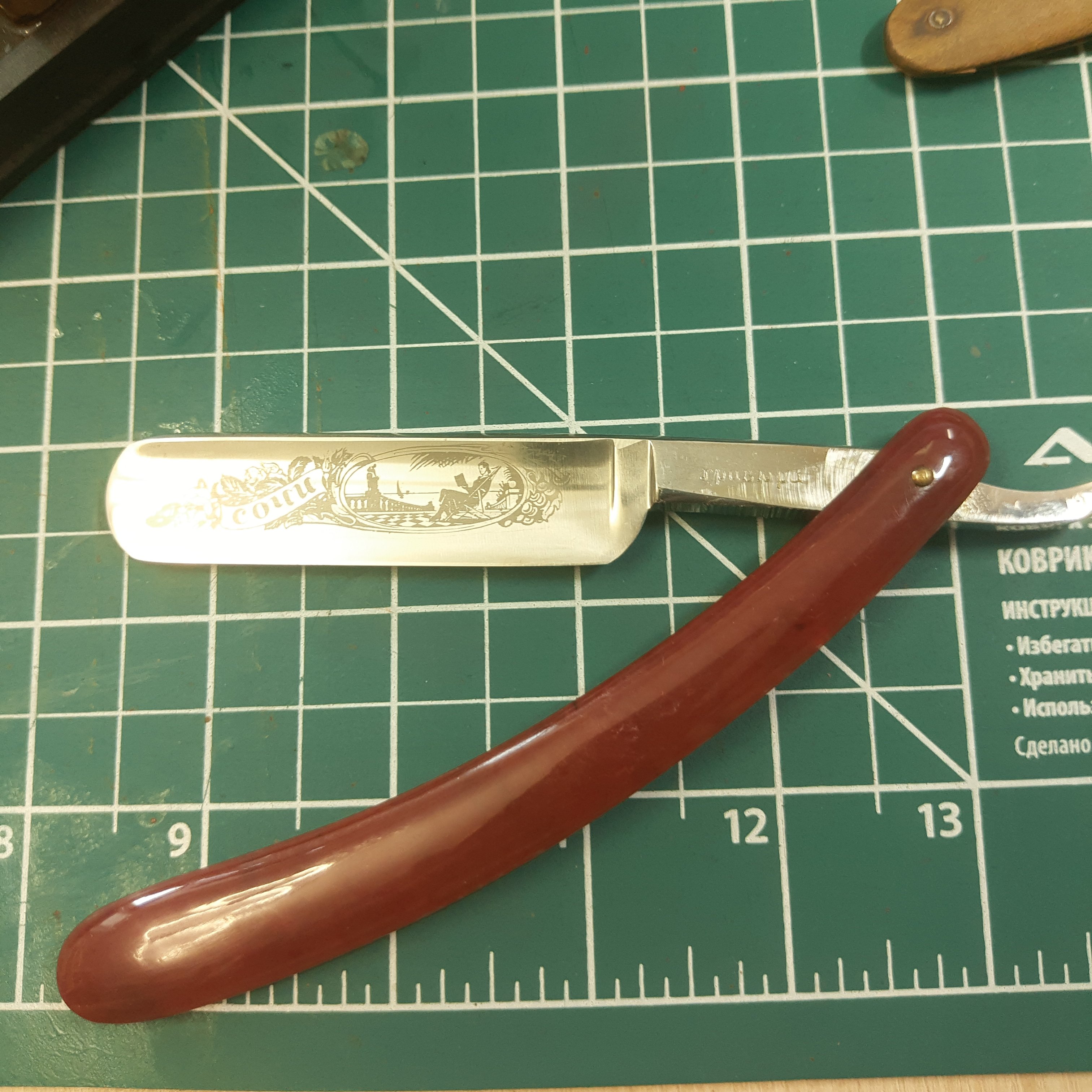 Самая "взрослая" бритва ориентировочно 1932-1934 года производства, с футляром, но без крышечки. С заводской заточкой, но со следами неправильного хранения.