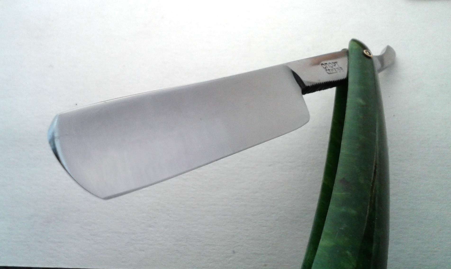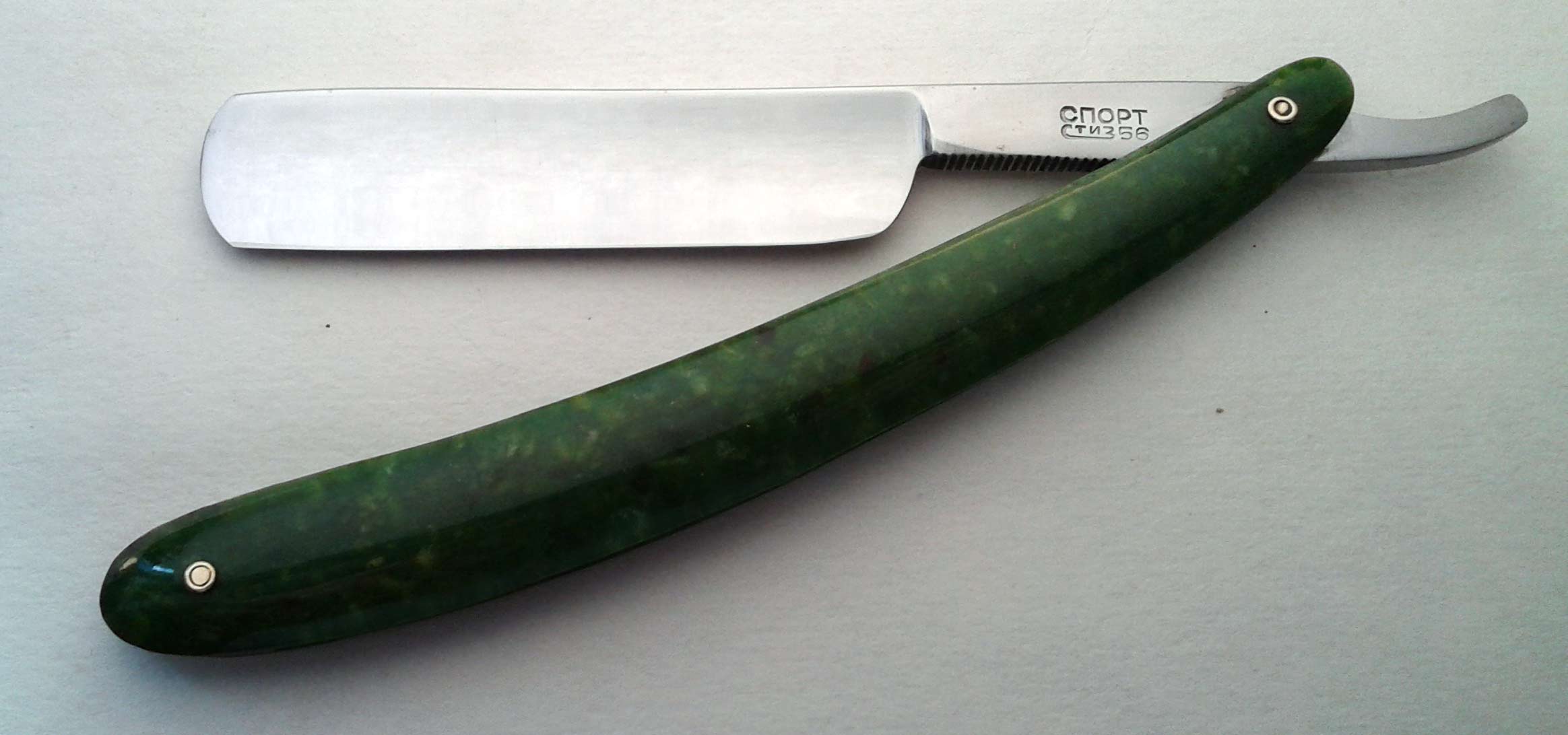 Спорт 1956 года выпуска - или вообще заводская заточка или точили буквально 1 раз и очень аккуратно, но склоняюсь больше к заводской. В комплекте и родной футляр того же 1956 года в таком же состоянии.