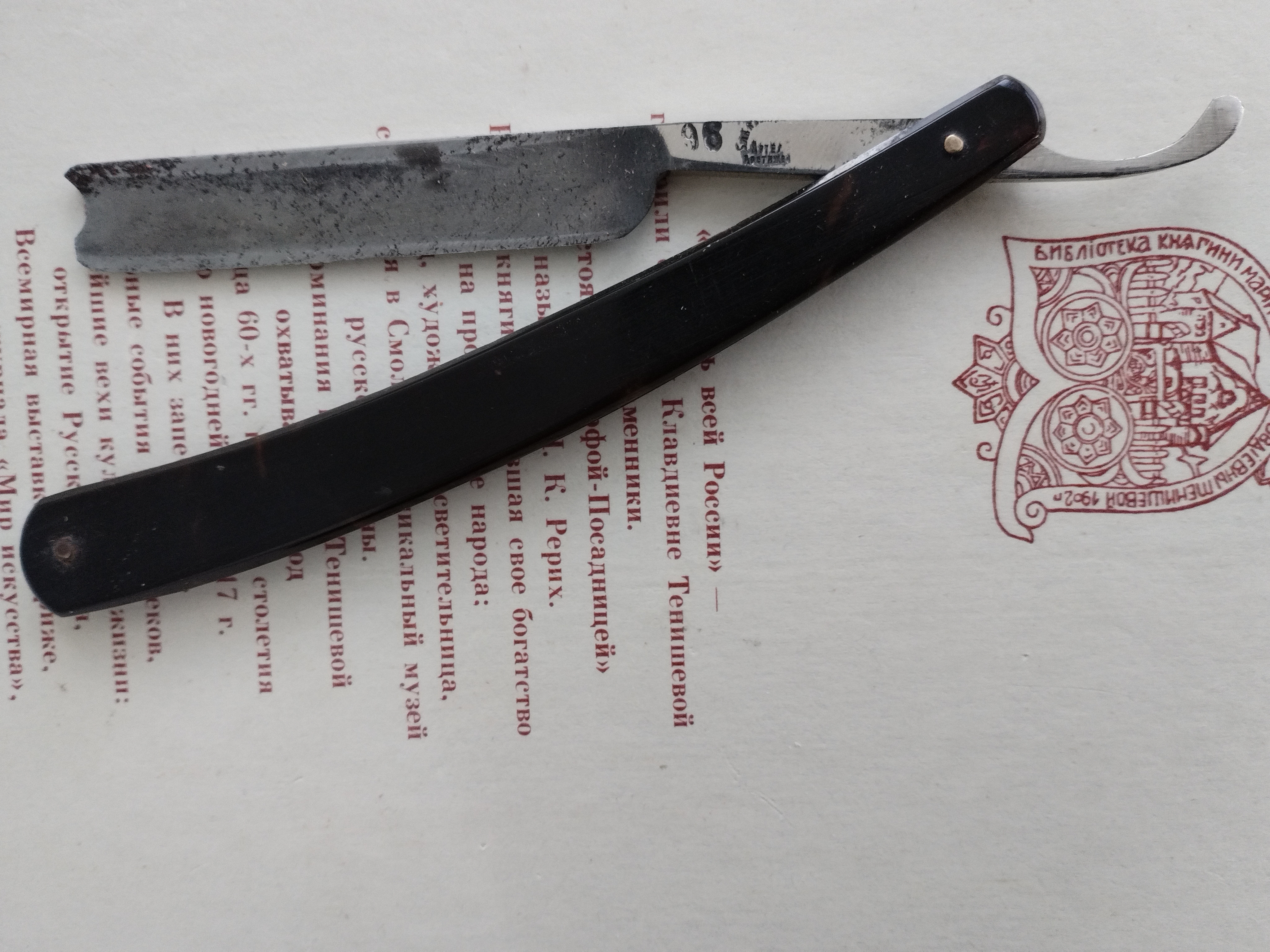 Бритва Ближнее Давыдово промколхозВыкладываю всё, как досталось. Клеймо полностью не влезло, эрль узенький(никелированный). Бритва миниатюрная, от пятки до носика 70мм.