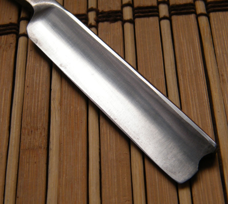 Бритва регулярно правилась на пастированном ремне, вследствие этого обратная улыбка (провал в середине лезвия). На мой взгляд полотно потеряло в ширину 1-1,5 мм. Чтобы привести в божеский вид у пятки и у носа также придется убирать 1-1,5 мм.