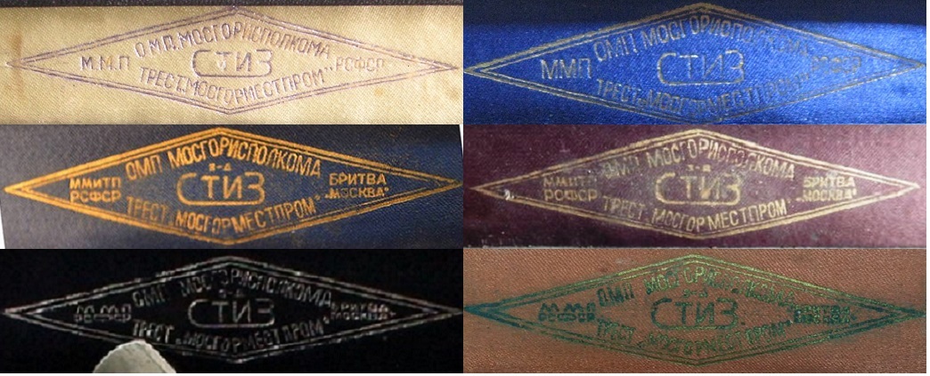 Второй тип - Р.С.Ф.С.Р. с точками между буквами, из за чего пришлось развигать верхние и нижние надписи. В тороговой марке-слове СТИЗ две центральные буквы ТИ меньшего размера.