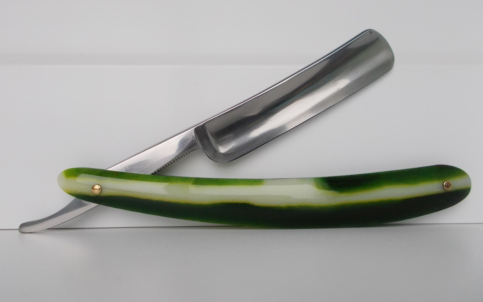 Кроме нового клейма, "красивого футляра" и нанесения на полотно "фотохимическим путем" дней недели, бритвы были двухзаковными, на верхней поверхности эрля сделали насечки, такие же, как и на нижней. Насечки сверху были не типичны для сооветских бритв и, по моему, так было сделано в СССР в первые. В 1955 году такие же насечки появились на бритвах Спартак и Любительская. Больше их ни на каких бритвах не наносили. Для "недельной" выпустили ручку нового образца, не широкую, вогнутую и продолговатую с заостренными концами, практически как у французских бритв. Вскоре эта ручка, с небольшими вариациями, станет основной на всех бритвах СТИЗа.