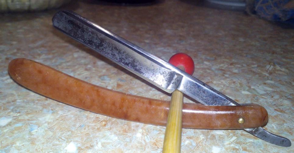 Volgar писал(а):Принес знакомый почти новую оправу с заржавевшим клинком опасной бритвы, уточенным и с улыбкой. Долго думал, выкинуть или нет. Решил попробовать, что получитЬся.