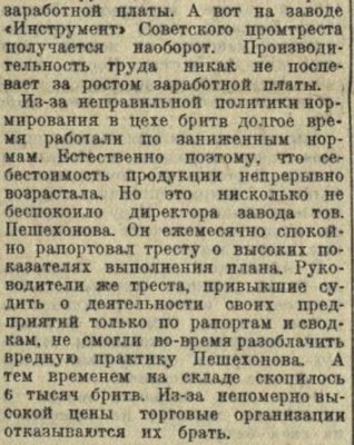 Газета "Вечерняя Москва" 19 мая 1941 года отрывок из статьи "Калькуляция с запросом", автор С.Богатырский Завод "Инструмент" - московский завод, принадлежал Промтресту. "Советского" - вероятно Советского района? (а был ли такой район?) На территории был Бритвенный цех. Директор завода - тов. Пешехонов. довоенное производство. Re: З-д "Инструмент" Сов. Р.П.Т. Москвапроб прав. Райпромтрест. Сов. Р.П.Т. Москва это райпромтрест Советского района Москвы. в 1941 году управляющим Советского райпромтреста был товарищ Юзенков. Советский район впервые сформирован 14 апреля 1936 года, в 50х годах упразднен, повторно район образован в 1969 году, но на совершенно иных территориях (см википедию)