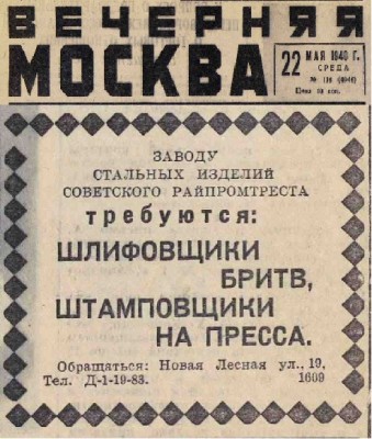 Завод стальных изделий, бритвы, надфили В Советском пром. тресте был только один завод по выпуску разных металлоизделий. вот список заводов Сов.рай. треста за 1938 год. По этому адресу и тел. номеру был гвоздильно-инструментальный завод. А в 1936 году это был Металлообрабатывающий завод №2, переточка и изготовление напильников. Директор Кнауэр Е.Ю. так что данный СТИЗ существовал с 1939 по 1940, а в 1941 его переименовали в завод "Инструмент"