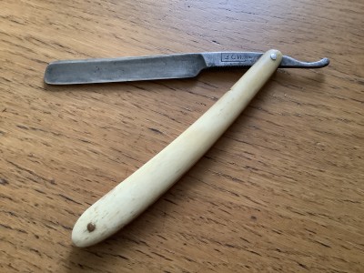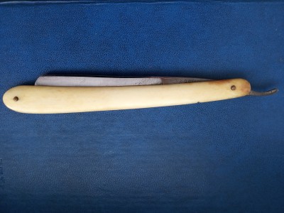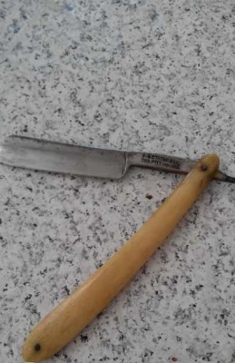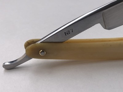С обратной стороны на эрле №7. Ручка - кость, родная 99%. Коробка не читается, шрифт проглядывается кириллица. "Завод Стальных Изделий" Сов. Р.П.Т. Москвакоробочка - артель Бритва, 52 год, не родная