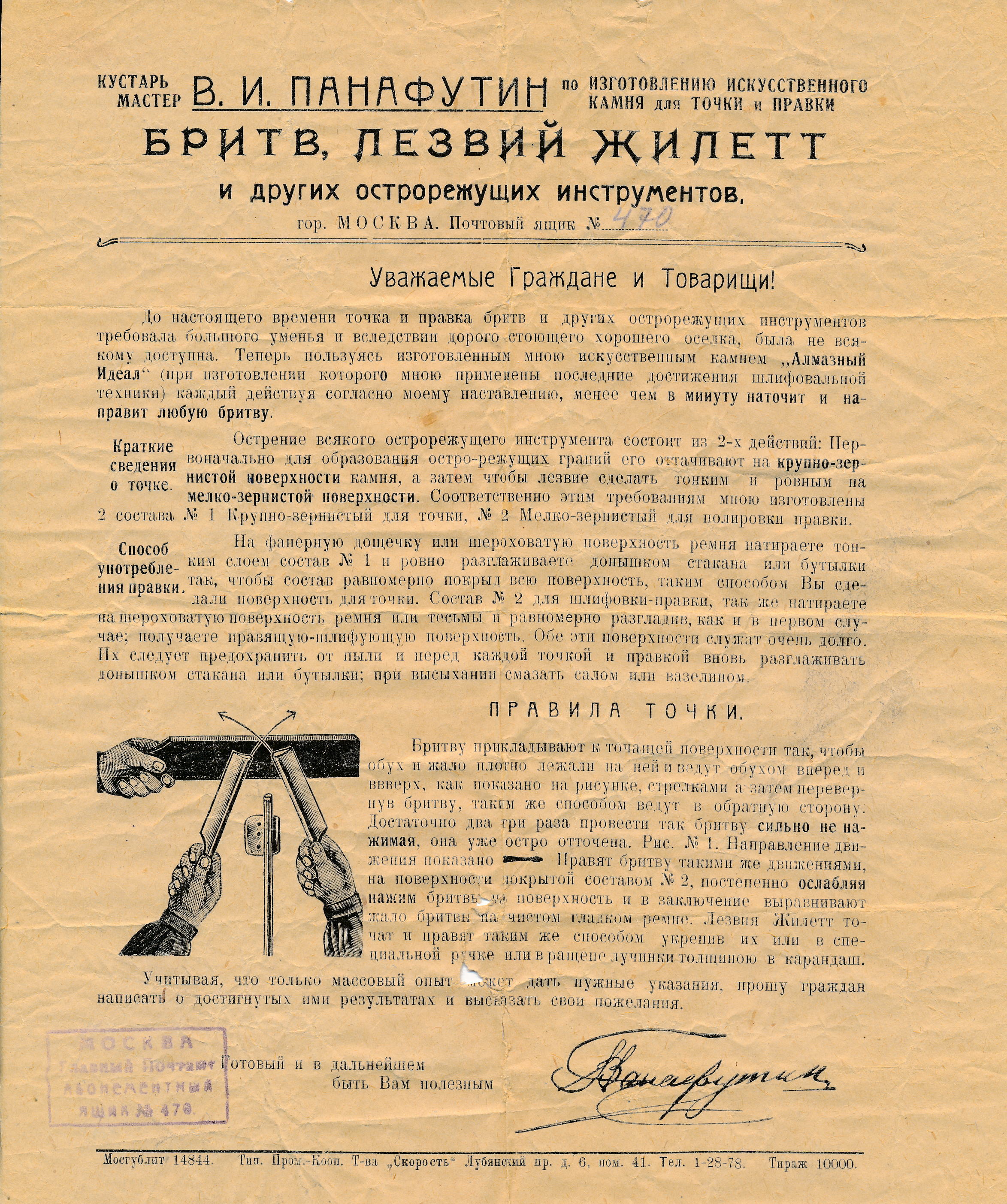 Панафутин Виктор Иванович. Род.1882, г.Москва, русский, б/п, обр.начальное, кустарь по изготовлению приборов для заточки бритв, прож.: г.Москва, ул.Останкинская, 20-5.
