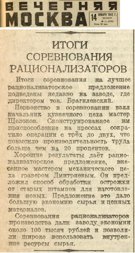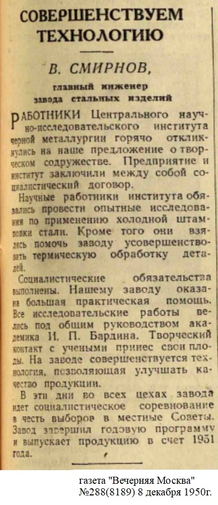 15 января 1952 года в газете "Вечеряя Москва" вышла большая статья о заводе Стальных Изделий.