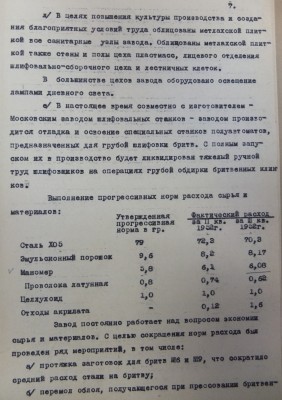 Проявили инициативу и при отделке ручки. Её делали сначала из целлулоида, затем перешли на акрылат. Когда акрылат стал поступать с перебоями, завод организовал собственное производство бритвенных ручек. Пробовали их делать из дерева, но, убедившись в плохом качестве, начали умело использовать отходы картона. Так было налажено фибровое производство. Отходы были пёстрые, разноцветные и довольно шершавые. Завод и это преодолел: изготовили штампы, в том числе и гравировочные, наладили окраску специальным лаком и не только в 6—7 раз снизили себестоимость ручки, но и начали изготовлять штампы для других фабрик."