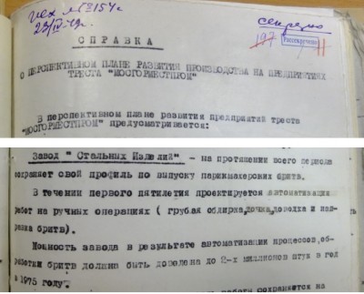 Завод "Стальных Изделий" - на протяжении всего периода сохраняет свой профиль по выпуску парикмахерских бритв. В течении первого пятилетия проектируется автоматизация работ на ручных операциях (грубая обдирка, точка, доводка и направка бритв)