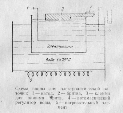 Электролитическая заточка бритв может производиться в небольших стеклянных ваннах емкостью 440 480 см3, длиной 180 мм, шириной 120 мм, высотой 150 мм.