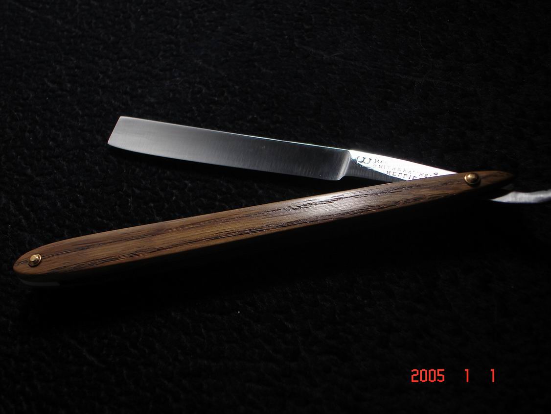 Скорее всего бритва в пользовании не была ,заводская шлифовка , бритва была разобрана , отполирована , ручка восстановлена , дополнил конструкцию шайбочками на осевом пине , что бы избежать трения ручки о полотно бритвы .