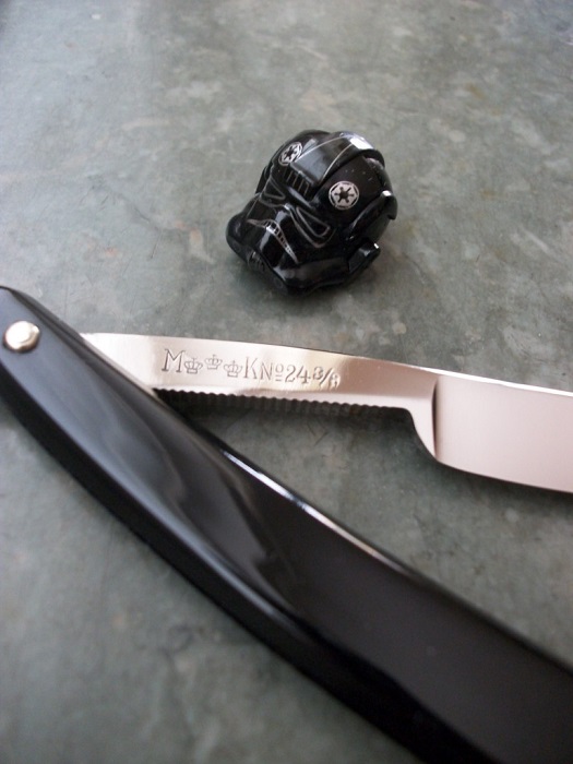 + а бритва хоть и новая, но реально старая..) Начертания иероглифов устаревшее, к тому же в таком сочетании сейчас не употребляются.. Челябинские мужики настолько суровы, что правят бритву не на ремне, а на роже.