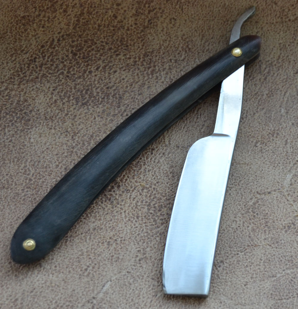 Старая Франция, предположительно начало XIX века. Массивный клин 7/8, рукоять рог, клинышек кость. При разборке обнаружилось еще одно скрытое клеймо. Отличная бритва в лучших традициях старой Франции. Продано Spoiler Show