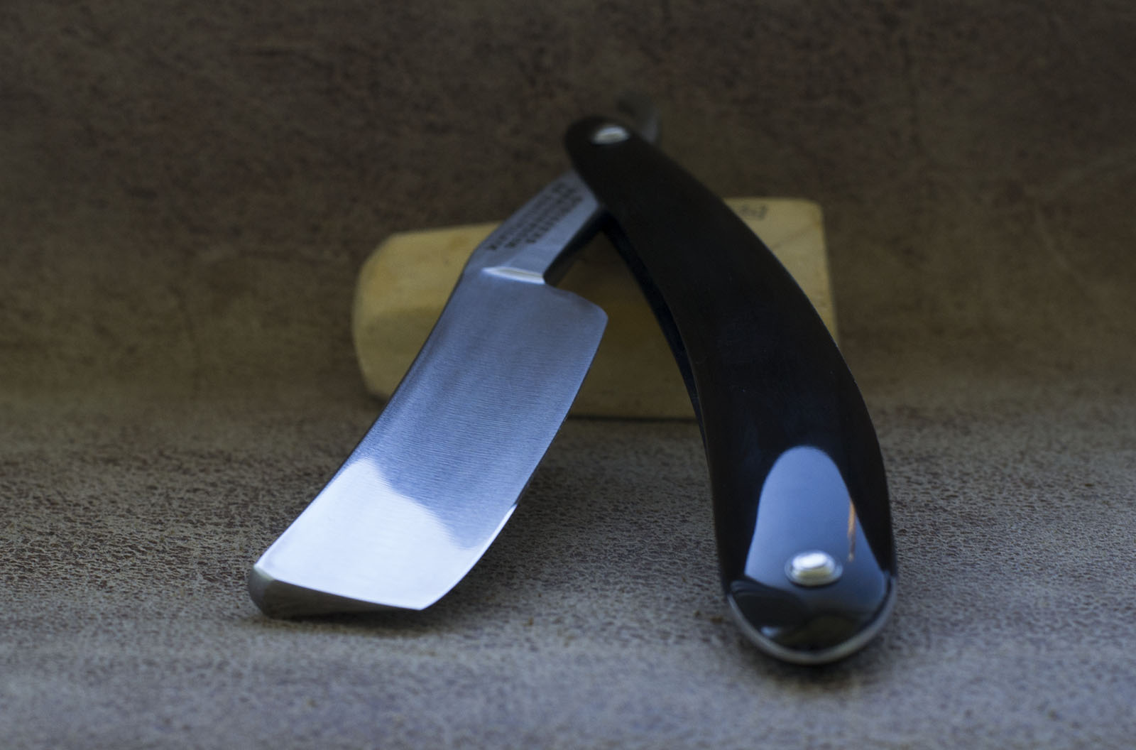 Ширина бритвы 18.5 мм. Новая роговая рукоять, обушок и эрл с дополнительными гранями, придающими неповторимую форму спинке. Бритва середины 19 века и как это часто бывает, рукоять не дожила до наших дней, была изготовлена новая из рога буйвола. Продано Spoiler Show