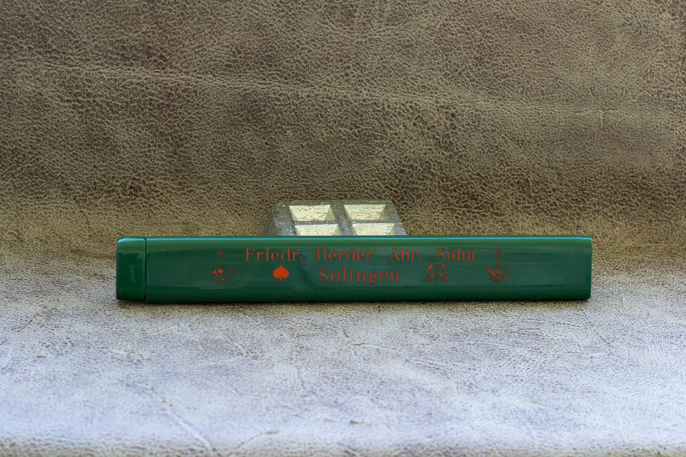 Немецкая опасная бритва из города Золинген (Solingen), одной из самых знаменитых марок и известнейших фабрик. История ее создания восходит к первой половине 17 века. Данная модель Friedr Herder 257 изготовлена в первой половине 20 века, скорее всего до второй мировой войны. Находится в отличном состоянии и никогда не использовалась. Ширина 5/8, пластиковая рукоять в походном исполнении. Бритва заточена и подготовлена к бритью, идеальная геометрия, тонкая и равномерная фаска. Отличный выбор для командировочной бритвы, рукоять хоть и выглядит массивной, но не является тяжелой, не доставляет какого либо дискомфорта по сравнению с бритвами с традиционной формой рукояти, поэтому не вижу каких либо противопоказаний или минусов при повседневном использовании. Продано. Spoiler Show