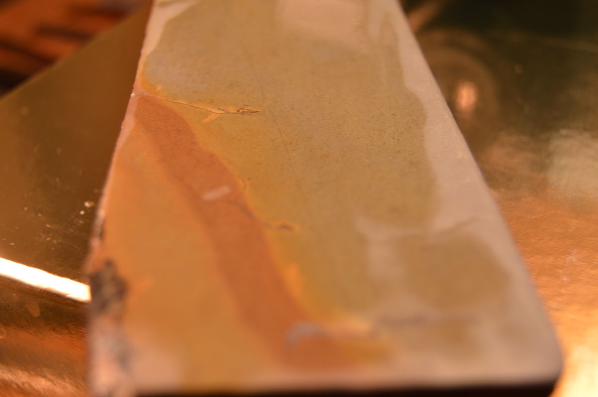 Re: Продаётся от artemarut1Spoiler Show Финишный камень из запасов, не новодел, лежит без дела! Сложно установить породу, цвет от асфальта(сухой) до черного(мокрый), твердость на 4, то есть если давить начинает выделять суспензию, работает конечно быстрее чем гуанси, выровнен, хорошо подошел бы владельцу таких камней как Арканзас, то есть камень в сете убирающий агрессивные риски, европейский размер - длина 225 ширина 41-43 толщина 25-26 Цена Продан . Прилагаю фото кромки тестовой бритвы после заточки на суспензии и чистом камне (5-7мин), фото 135 крат, соответственно видна только кромка и фото бритвы отдельно с линейкой. Spoiler Show
