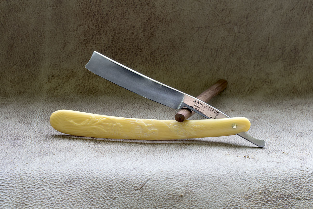 Бритва от одного из старейших производителей бритв в мире, ведущего свою история с конца 17 века, данная бритва была произведена в середине 20 века. Ширина 19 мм. (6/8) Бритва на момент реставрации имела незначительные следы заточки, я лишь немного освежил полотно и отполировал рукоять. Отлично подойдет для новичка. Заточена и готова к бритью. Продано Friedr Show J.A. Hellberg. Опасная бритва от одного из самых известных и самых титулованных производителей Швеции. Продукция Йохана Хеллберга завоевала множество наград на самых разных промышленных выставках. Данный клин был сделан в конце 19 - начале 20 века, имеет фигурную рукоять из целлулоида, которая немного утратила свой внешний вид, но является еще довольно прочной и хорошо выполняет свои функции. Изготовлена из углеродистой стали, ширина 5/8, заточена и готова к бритью. Продано J.A. Hellberg Show