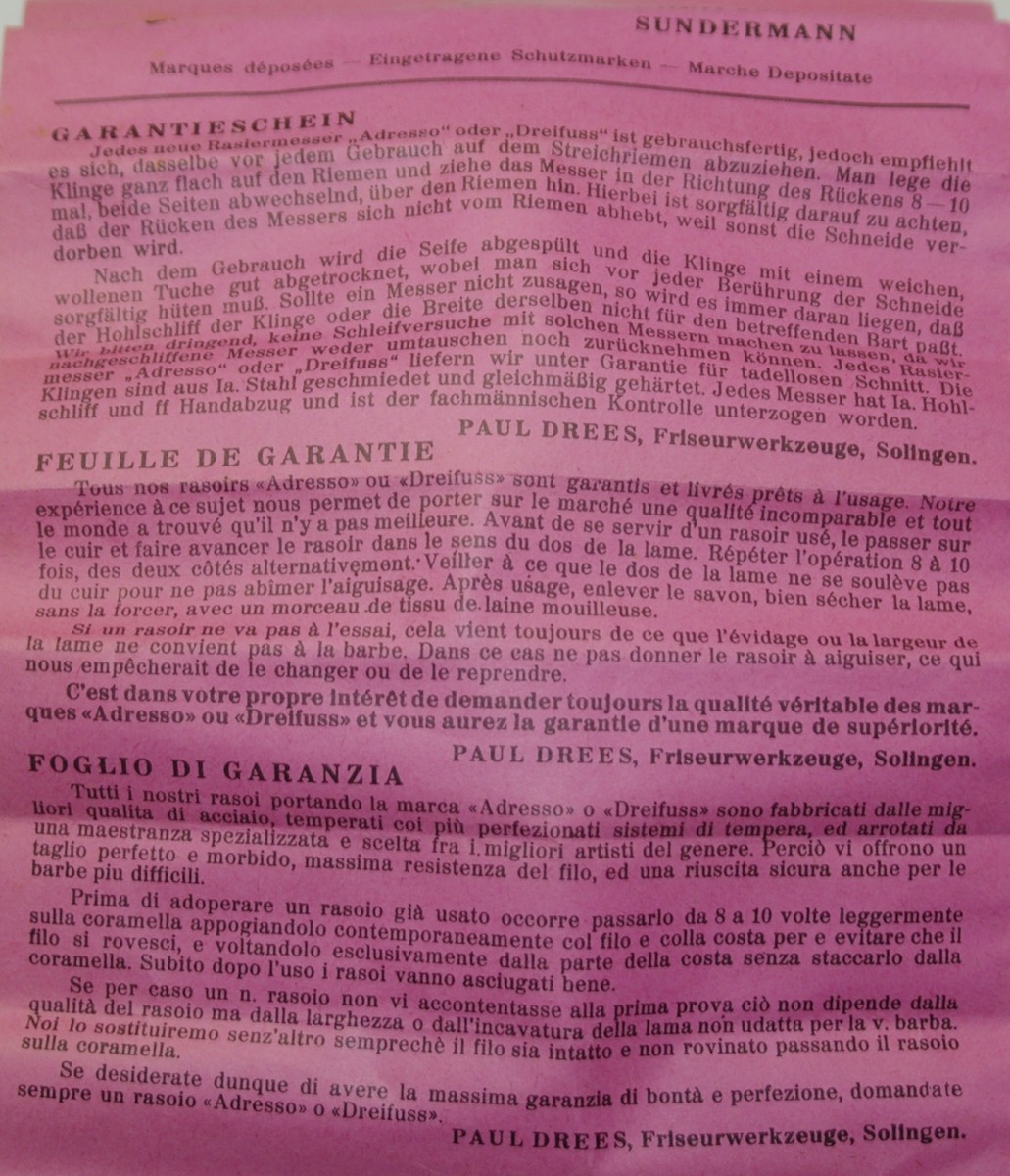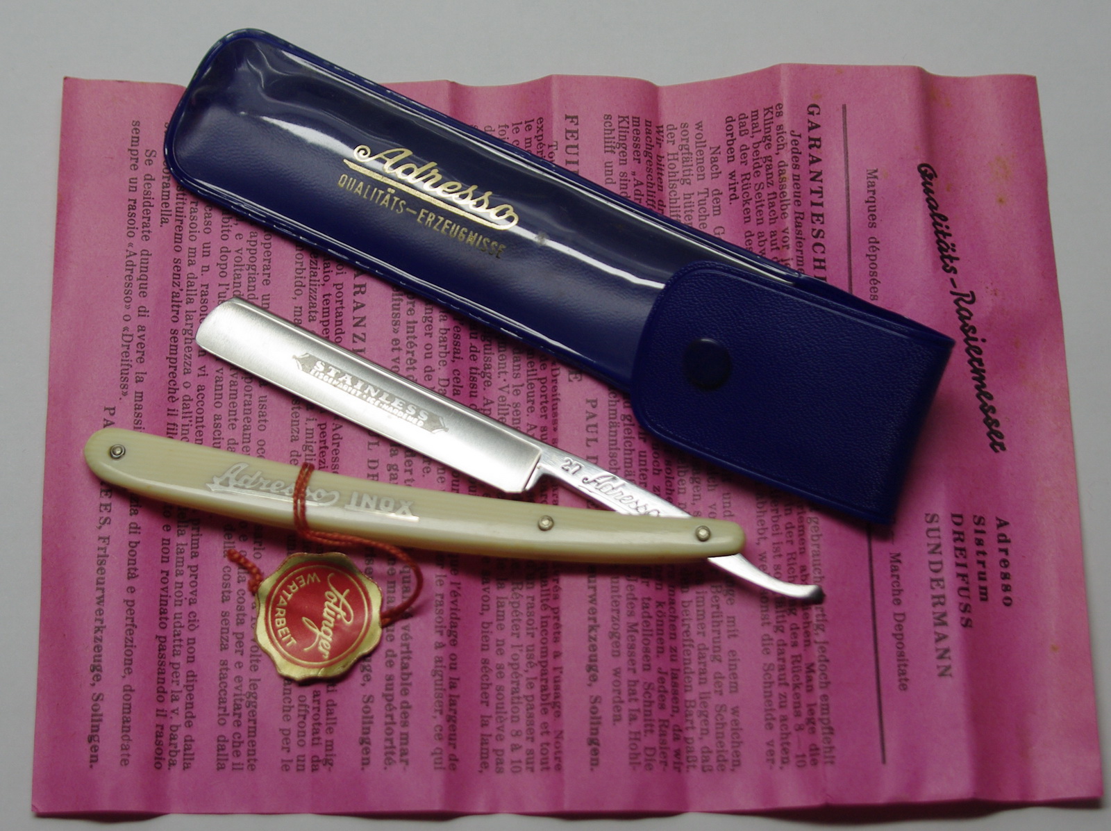 Продам Adresso 27 INOX 4/8 Solingen великолепная нержавейка с криогенной обработкой бритва в девственном сохране. Гарантия повышенной девственности это медалька на красной веревочке С бритвой ничего не делал. Есть минимальные следы потемнения, НО т.к. это нержавейка то они уйдут от простого протирания любой безабразивной пастой типа флитца. По желанию заточу заново (т.к. за десятилетия перекладывания бритвы все таки первичная острота слетела) Цена 8000 рублей