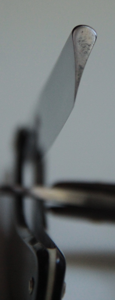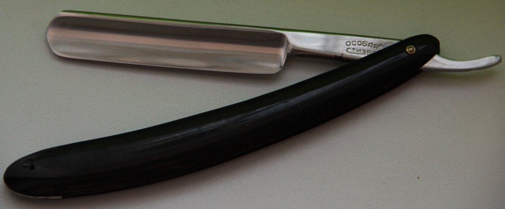 Я не знаю, для каких целей и зачем сделана именно эта бритва, но вот такой гринд хвостовика смотрится очень красиво и брутально.Не думаю, что найдётся еще одна такая бритва.Поэтому, бритва не только для бритья, но и для коллекции, в качестве редкой. По стали и форме лезвия очень похожа на Стизовскую "Особую". Ручка , пины идентичные бритвам Стиз. Бритва не была в пользовании, имела заводскую заточку. Немного пришлось освежить металл полотна от патины и заново заточить. Уже протестирована лично. Бритьё чистое, хотя немного агрессивное, в связи с твёрдостью стали. Геометрия близкая к идеальной. Не разбиралась. Всё родное.